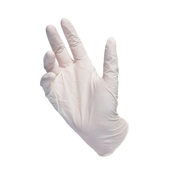 Luva de segurança confeccionada em borracha natural, com pó bioadsorvível, ambidestra e superfície lisa.